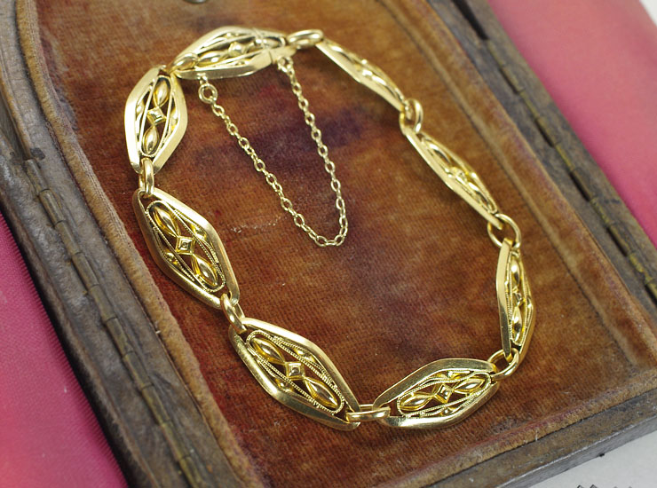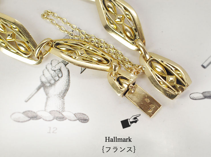ブレスレットのクラスプ(留め具)部分にフランスの18金のホールマーク(鷲の頭)と製造メーカーのマーク入り。アンティーク18金フィリグリーブレスレットは良い状態です。