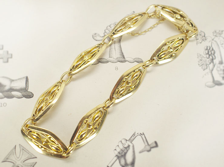 1890年-1900年頃のフランス製アンティークブレスレットです。繊細なフィリグリー細工ながら、ゴールドの重量感が心地よいボリュームのあるブレスレット。それぞれのパーツがわずかに曲線を帯びていますので、しなやかに手首に沿います。全体の長さが約21センチと長めです(着用写真のモデル:手首周り14センチ)。手首が細い方には大きめですが、ゆったりとお着けになりたい方にはまさにぴったりなブレスレットです。8つのパーツで構成されており、1つのパーツは縦9.5ミリ×横22ミリです。