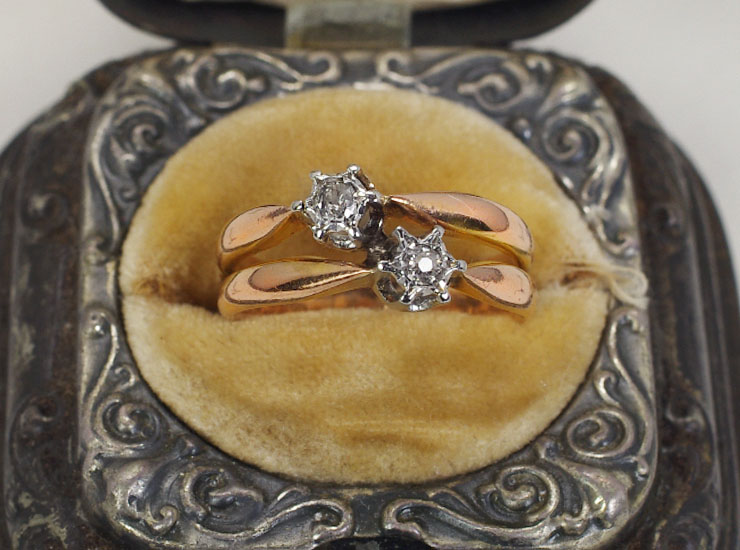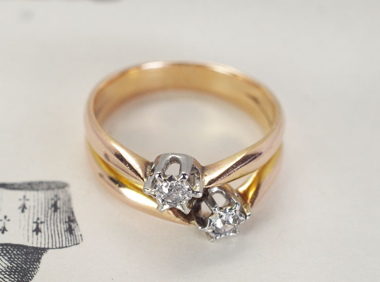 1890年頃のフランス製アンティークリングです。絶妙なバランスで2つの指輪が重なったような美しいデザインの指輪。オールドカットのダイヤは2ミリ〜2.2ミリと小さいのですが、よく見ると台座が星の形になっていてとても可愛らしく、また台座部分のみホワイトゴールド(18金)になっていますので、実際よりダイヤが大きく見えます。フランスのアンティークジュエリーのゴールドは、ピンクを帯びていてとても綺麗な色のものが多いのですが、こちらのリングもフランスのアンティークらしい色合いの美しいゴールドです。