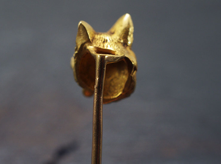 ルーペで見ると、作りの細やかさに驚かされます。キツネのふさふさとした毛並みに、鋭い目、大きく開かれた口から覗く歯の一本一本まで丁寧に作られています。キツネの頭部分のサイズは縦13ミリ×横10ミリ。ピン部分の長さは41ミリ。正面から見たクラバットピン全体の長さは47ミリ。大変美しいアンティーククラバットピンです。