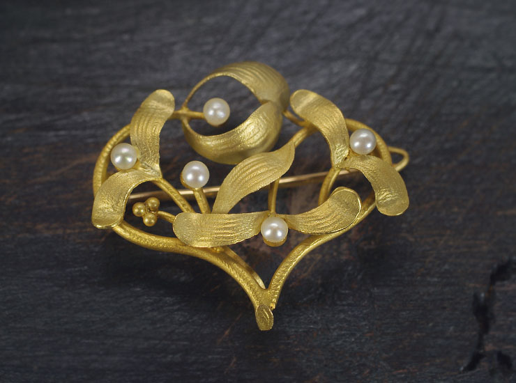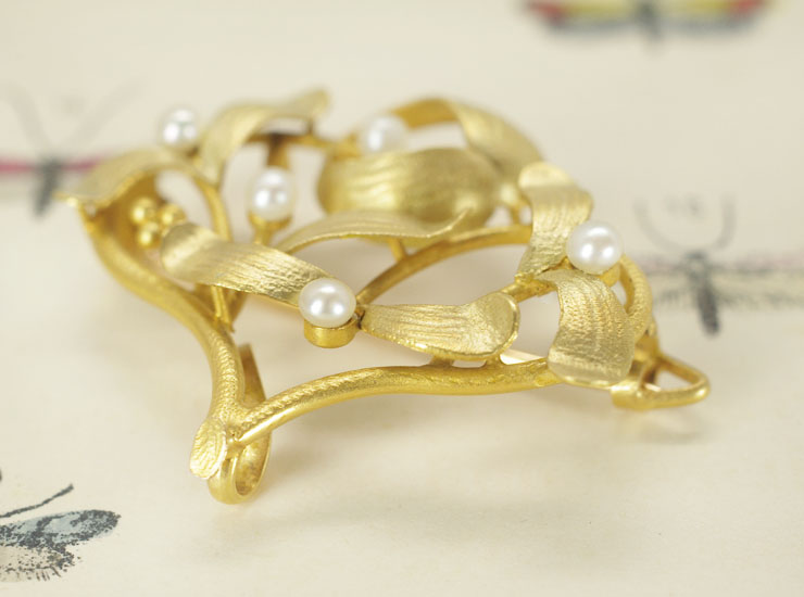 1890年頃のフランス製アンティークブローチ・ペンダントです。アールヌーヴォーらしい曲線で、宿り木を表現しています。宿り木はフランスアンティークジュエリーの中でも人気で時々見かけますが、これほど美しく、状態の良いものにはなかなか出会えません。葉の柔らかなうねりや膨らみが生き生きと表現され、小さなパールの実のみずみずしさには思わず見とれてしまいます。パールは2ミリ〜2.5ミリ。