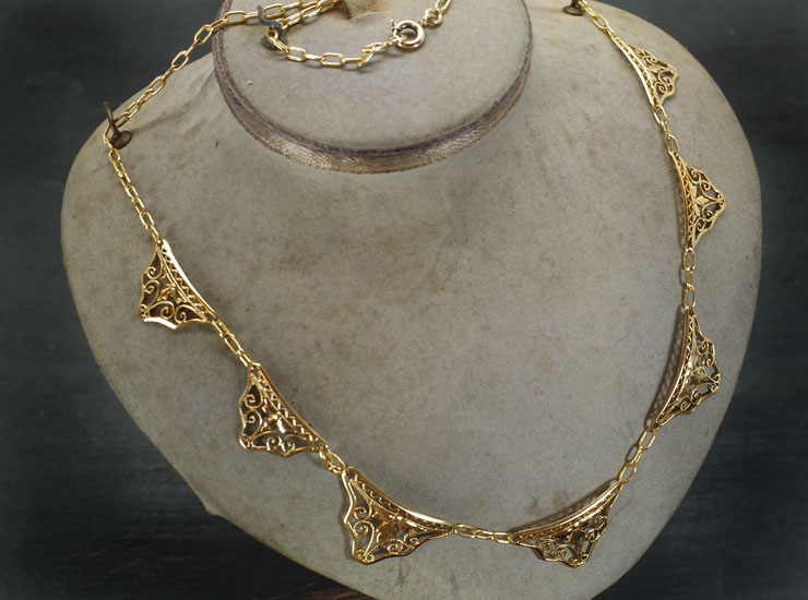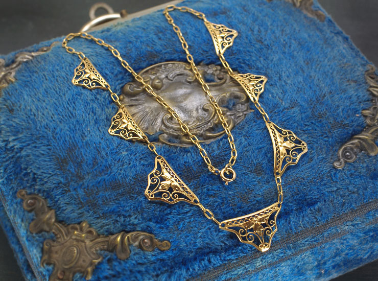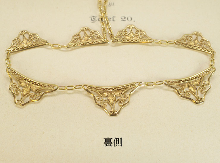 ネックレスは、7つのパーツとチェーン部分で構成されています。中央の3つの大きめのパーツは縦23ミリ×横23ミリ。端2つの小さめのパーツは縦10ミリ×横17ミリ。ネックレスの長さは44センチ。フランス製アンティークジュエリーでしか味わえないしなやかな曲線美のフィリグリーネックレスです。