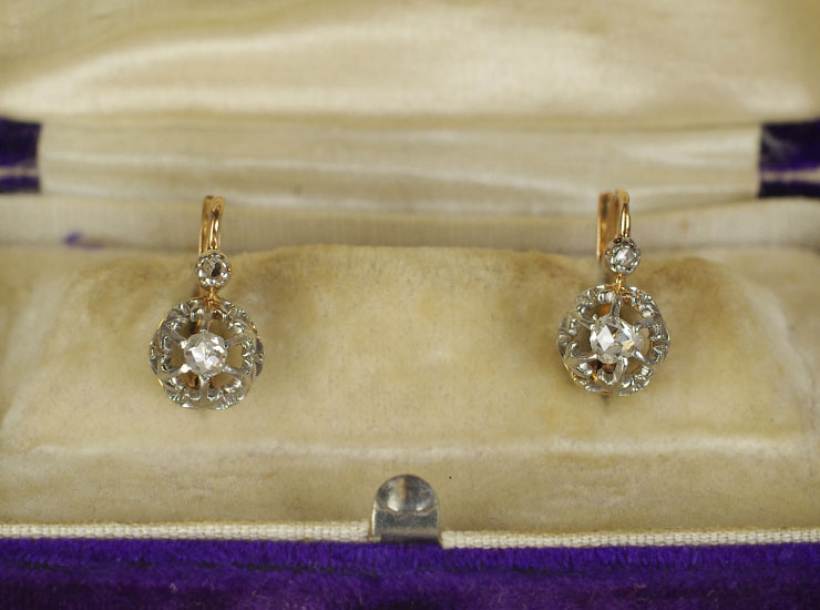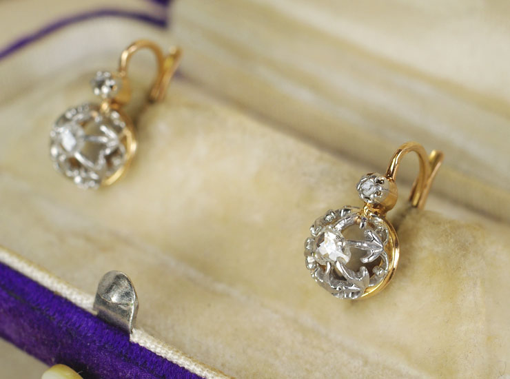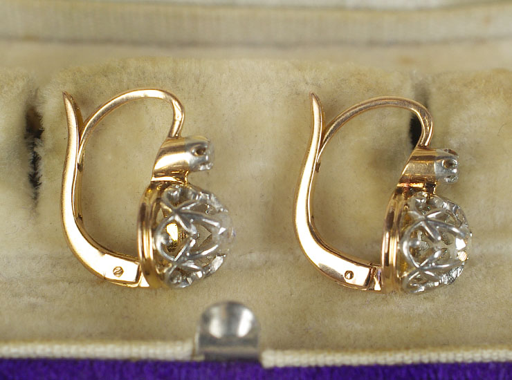 1900年頃のフランス製アンティークピアスです。ローズカットダイヤの輝きが美しいピアス。留め具が上下に開閉するフランス製アンティークピアスでも特に人気のあるタイプです。ピンクを帯びた18金ゴールドと18金ホワイトゴールドのツートンカラーですので、お手持ちのジュエリーにも合わせやすく、毎日活躍してくれそうです。ゴールドの細工の透かしから光を存分に取り入れ、ダイヤがキラキラと美しく輝きます。ダイヤは、下のダイヤは約2.5ミリ、上のダイヤが1ミリ。着用時の全体の長さが14ミリとコンパクトですが、このタイプのピアスは実際に着用すると、さりげなくも存在感がありとても美しいです。