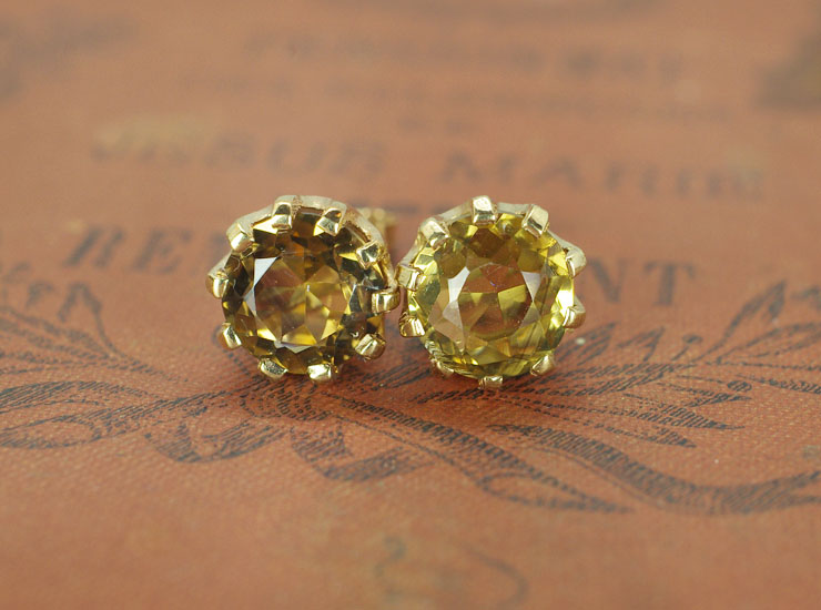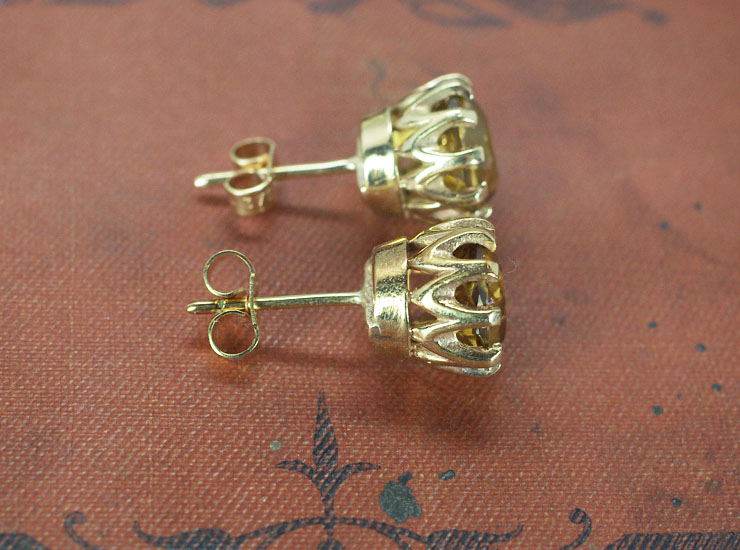 1970年頃のイギリス製ヴィンテージピアスです。黄色を帯びた明るいブラウンの美しい石はクォーツです。直径約10ミリの大粒クォーツが包まれるように爪に留められたスタッドタイプのピアスです。コロンとした厚みのあるフォルムが可愛らしく、耳元を程よい華やかさで飾ってくれます。地金は9金。