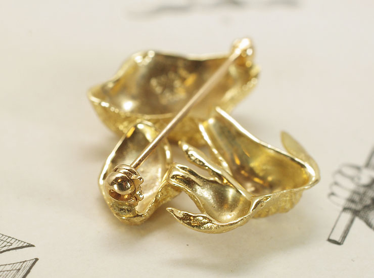 地金は14金で、美しいイエローゴールドです。きのこの裏は立体的にくりぬかれた形状になっていますので、布に沿うような自然な付け心地です。ピン留め部分は、ピンが外れないようにロックを回して固定するタイプで失くしてしまう心配もありません。楽しくて可愛らしいきのこのヴィンテージブローチです。