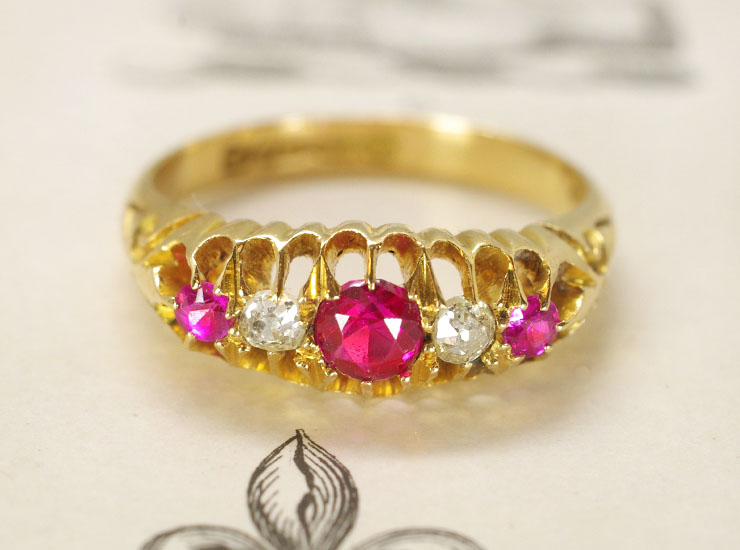 1913年のイギリス製アンティークリングです。明るくヴィヴィッドなピンクの合成ルビーとオールドカットのダイヤ(天然)の美しい指輪。合成ルビーとは、化学組成や硬度、光の屈折率などは天然ルビーと全く同じですが、人間の手で作られた人工石のことを言います。合成宝石の歴史は古く100年以上前にも遡ります。合成ルビーだから品質が悪いということはまったくなく、天然ルビーと変わりない美しさです。またリングの作りも丁寧で美しい細工が施されています。オールドカットのダイヤ2石がキラキラと輝き、良いアクセントになっています。