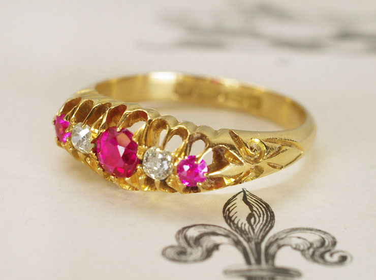 リング内側に18金、1913年を示すイギリスのホールマーク(刻印)入り。アンティーク18金合成ルビーダイヤリングは良い状態です。