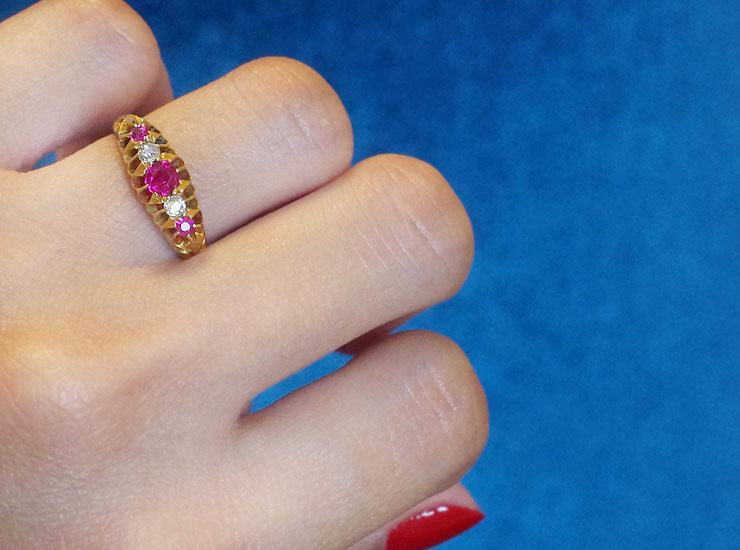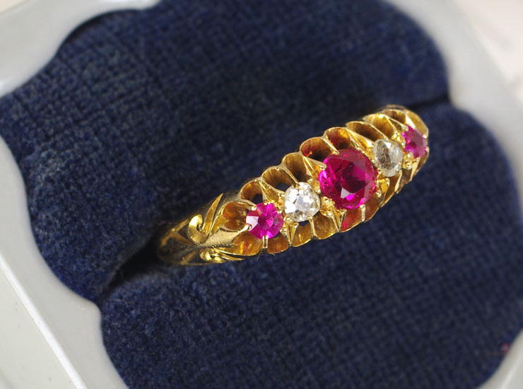 地金は18金。中央のルビーは3.4ミリ、両端のルビー2石は2.3ミリ、ダイヤ2石は2.2ミリ。お求め安い価格ですので、アンティークジュエリーを日常的に楽しみたい方に大変お勧めです。