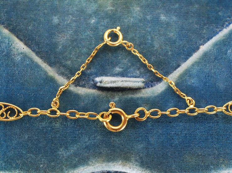ネックレスにフランスの18金を示すホールマーク(鷲の頭)、750(18金)と数か所に刻印入り。アンティーク18金フィリグリーネックレスは良い状態です。