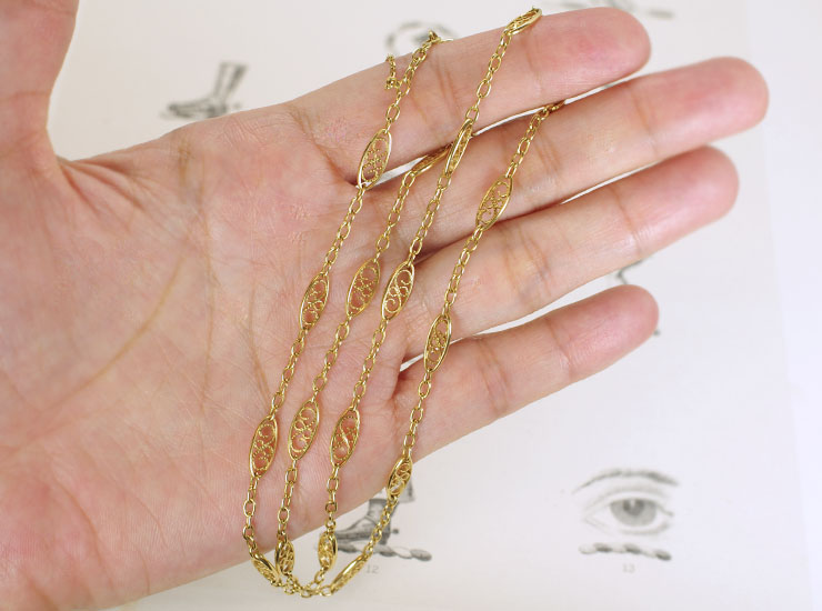 1900年頃のフランス製アンティークネックレスです。18金フィリグリーの美しいネックレス。楕円形の網目の金細工は縦4.5ミリ×横11ミリ。チェーンを間に挟み、合計18個の網目細工で構成されています。どんなファッションにも合わせやすく、一つは欲しいアンティークネックレスです。網目部分はあまり大きくありませんので、バチカンが大きめのペンダントでしたら、ネックレスに通してチェーンとしてお使いいただくのもお勧めです。重量は8.8グラムとしっかりとした作りで、留め具部分は万が一に備えて2重になっています。このような作りはハイクオリティなネックレスの証です。丁寧な金細工がアンティークならではの大変美しいアンティークフィリグリーネックレスです。