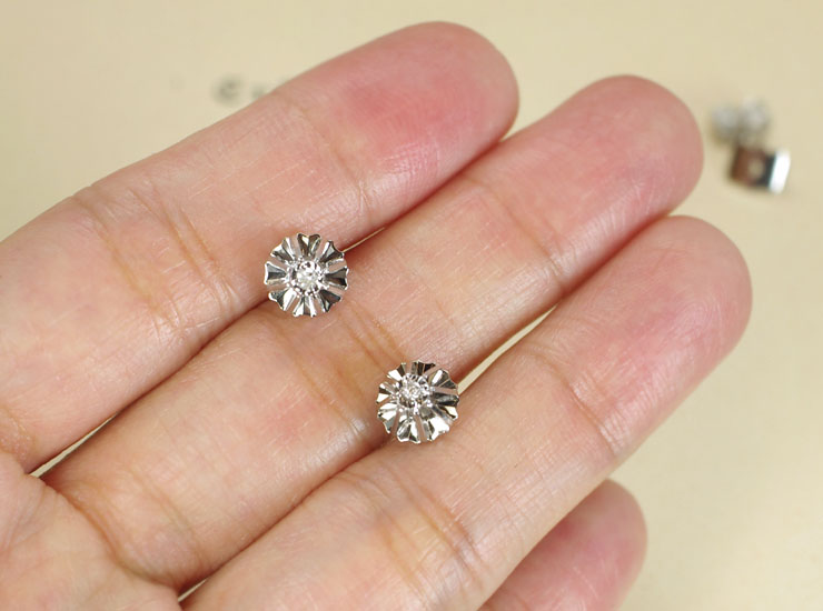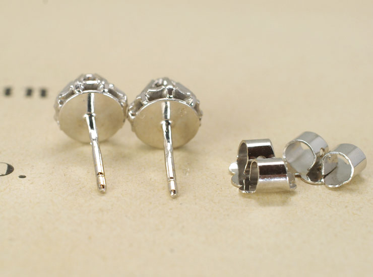 ピアスのポスト(耳に通す部分)にフランスの18金のホールマーク(鷲の頭)、メーカーのマーク入り。ヴィンテージ18金ホワイトゴールドダイヤピアスは良い状態です。