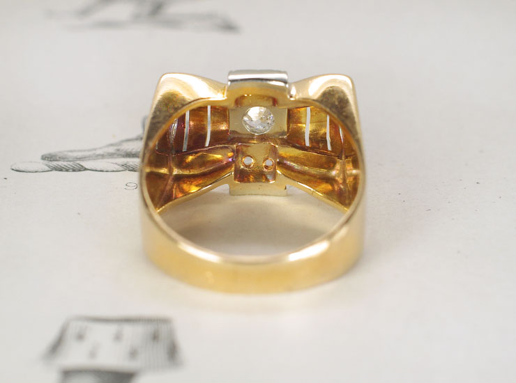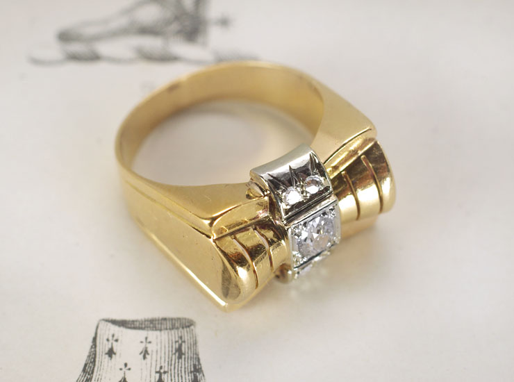 1940年頃のフランス製ヴィンテージリングです。タンクリングと呼ばれるボリュームのある華やかな指輪。ゴールドがたっぷりと使用された重量感のあるリボンが目を引きます。直線と曲線のアールデコのデザインを引き継ぎ、当時の革新的なエネルギーが感じられるリングです。