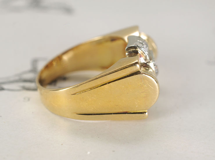 リング外側に、フランスの18金のホールマーク(フクロウ)入り。ダイヤに肉眼では確認できない程度の非常に小さな傷がありますが、リングは全体的に良い状態です。
