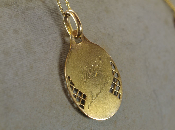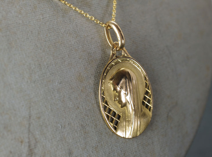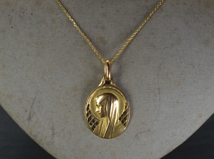 1925年頃のフランス製ペンダントです。祈りを捧げる聖母マリアのメダイ・ペンダント。その表情は穏やかで優しさに満ちています。背景には後光が輝き、透かしの細工が丁寧に施されています。裏には元持ち主の女性の名前と日付が彫られています。「Denise 13 Septembre 1925」「ドニーズ 1925年9月13日」。お守りのように身につけていたのでしょうか。女性の人生に思いを巡らせる物語を秘めた美しいアンティークペンダントです。地金は18金。重量は3.6グラムと重厚感のあるしっかりとした作りです。