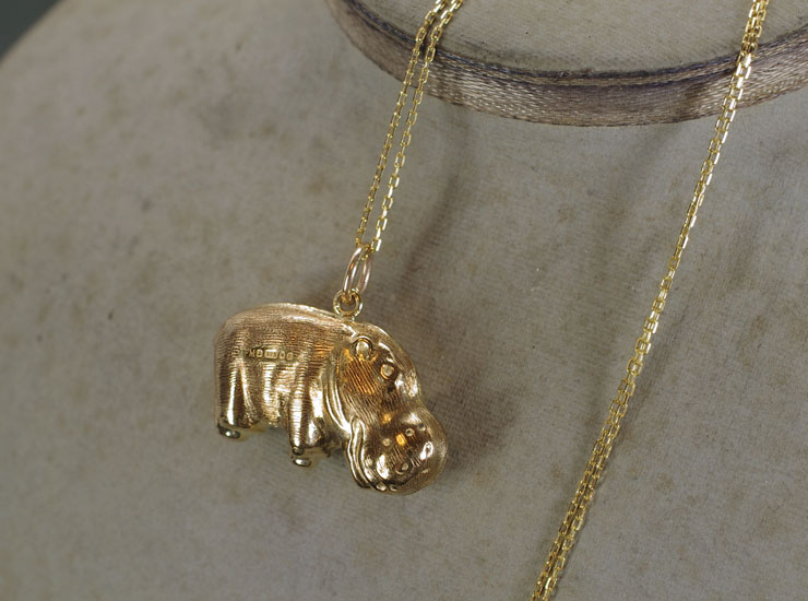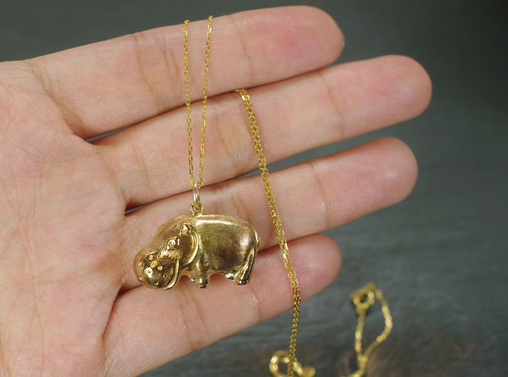 1978年のイギリス製ヴィンテージチャームです。ぷっくりとしたカバがモチーフのゴールドチャーム。大きな頭がアンバランスなのがまた可愛らしく、思わず笑顔になってしまいます。カバがモチーフのゴールドジュエリーなんて日本では見つからないのではないでしょうか。コロコロとした立体的な作りで、中が空洞のタイプですので軽量です。地金は9金。愛嬌たっぷりの可愛らしいカバチャームです。