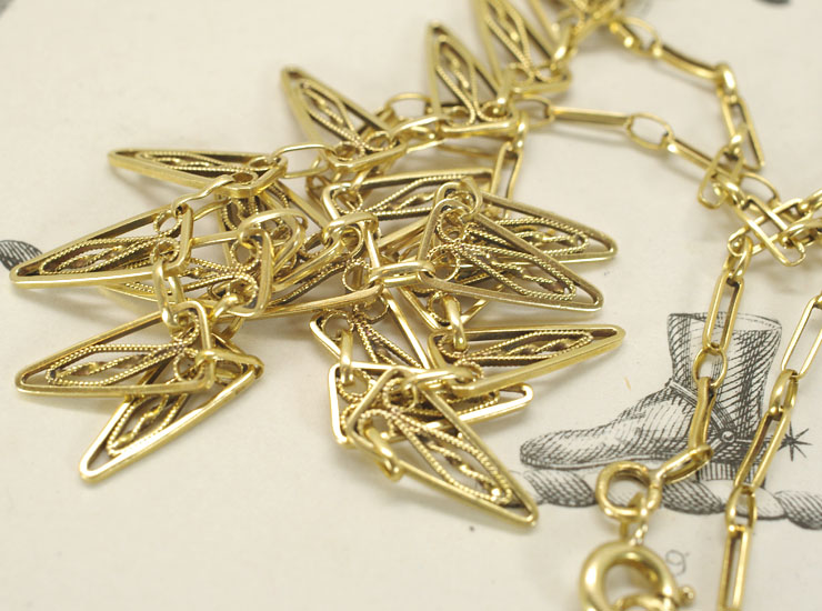 1910年頃のフランス製アンティークフィリグリーネックレスです。地金は18金イエローゴールド。三角の網目の金細工が胸元に広がる美しいネックレスです。三角モチーフは11ミリ×5ミリと小さめで、一つ一つに細やかな細工が施されています。三角モチーフは全部で20個並び、この部分の長さは15.5センチです。着けた時にちょうど良いバランスで、レースのように胸元に広がり上品に華やぎます。透かしから肌が透けて見え、繊細な模様が浮かび上がり、軽やかでとても綺麗です。長さは46センチ。重量は8.8グラムとしっかりあります。大変美しいアンティーク18金フィリグリーネックレスです。