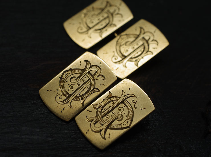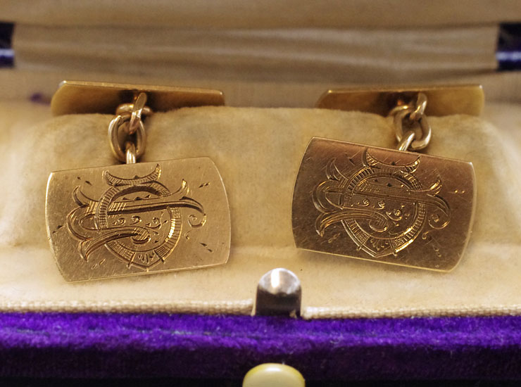 1928年のイギリス製アンティークカフスボタン(カフリンクス)です。モノグラムが丁寧に手彫りされています。サイズは縦17ミリ×横10ミリ。チェーンは17ミリ。掲載写真ではモノグラムが逆さになっていたりしますが、すべて同じモノグラムが彫られています。地金はすべて9金。ややトーンの薄いイエローゴールドですので、ゴールドジュエリーに慣れていらっしゃらない男性の方でもご使用いただきやすいと思います。