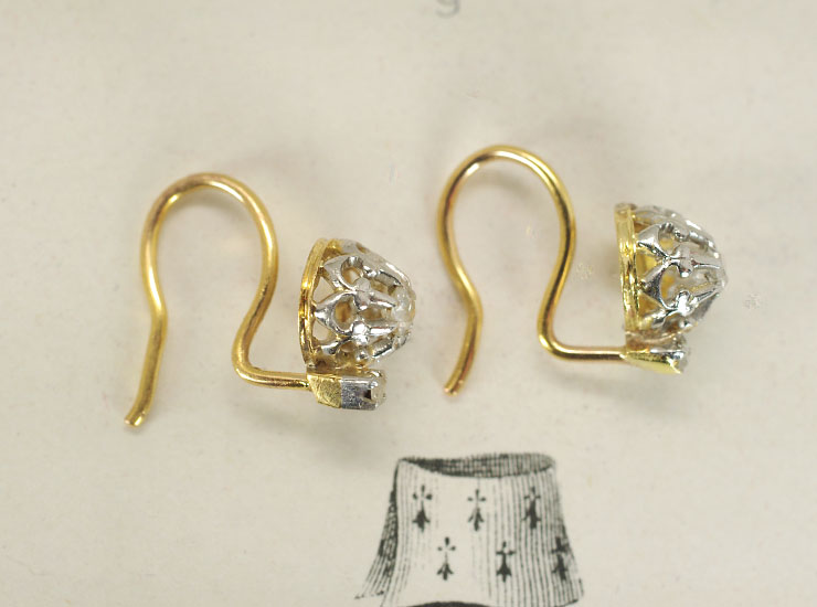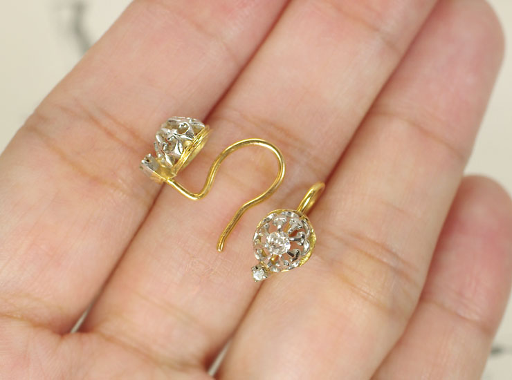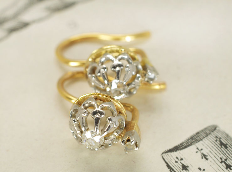 1900年頃のフランス製アンティークピアスです。オールドカットダイヤからキラキラと光が零れ落ちて、耳元を可憐に飾ってくれます。引っ掛けて着用するタイプのピアスですので、毎日気軽に身につけていただけます。着用時の全体の長さは17ミリ。モチーフ部分は7.5ミリ。上ダイヤは2.5ミリ、下は1ミリとダイヤのサイズは決して大きくありませんが、美しい輝きとレースのような金細工でさりけなくも存在感があります。