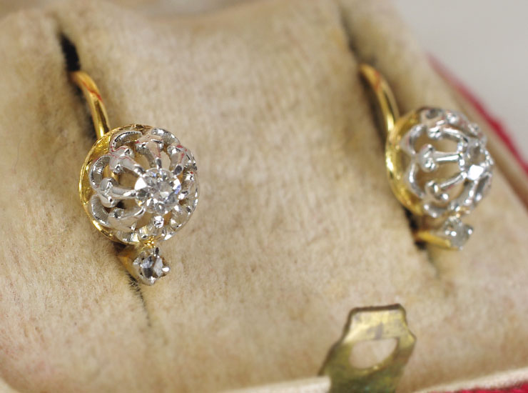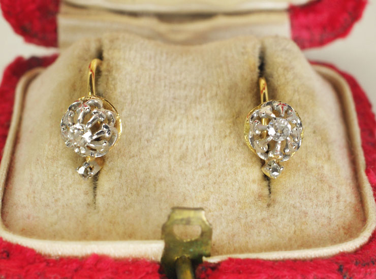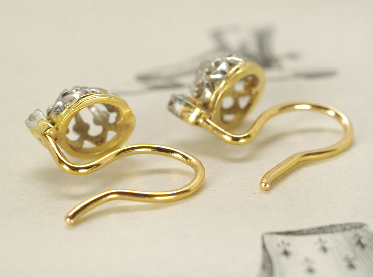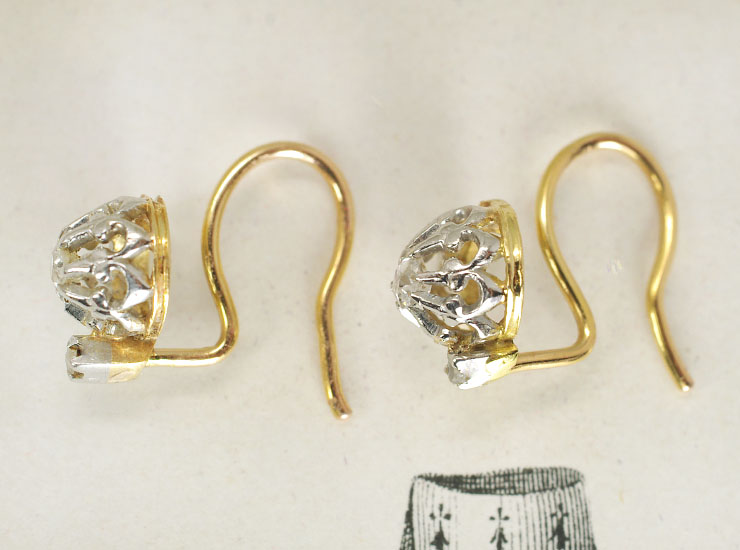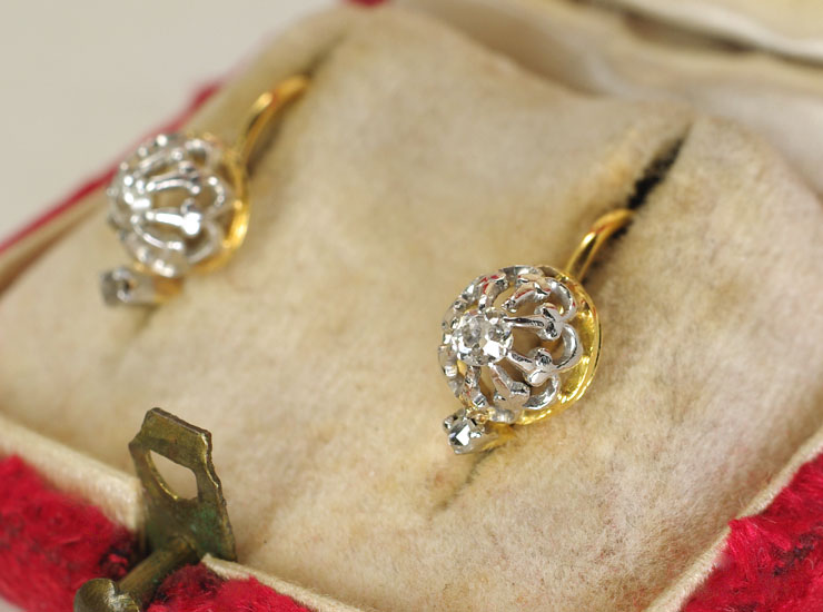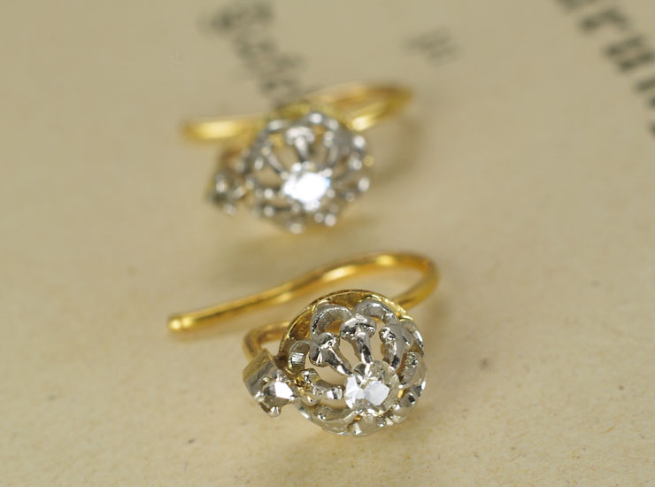 地金は18金イエローゴールドと18金ホワイトゴールド。華奢に見えますが、ポスト(耳に通す部分)もしっかりしており、一般的な日本製の18金ピアスに比べて太さと安定感があります。他のジュエリーとも合わせやすく、アンティーク初心者の方にもお勧めの美しいアンティークダイヤピアスです。