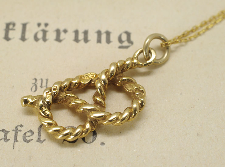 1960年頃のイギリス製ヴィンテージチャームです。ノット(結び目)は、恋人同士の愛、友情、絆のシンボルとして用いられてきました。ねじったロープで数字の8を書いたような形をしています。焼き菓子のプレッツェルにも似ていて、デザイン的にもユニークです。地金は9金。ありそうでなかなか見つからない素敵なヴィンテージゴールドチャームです。