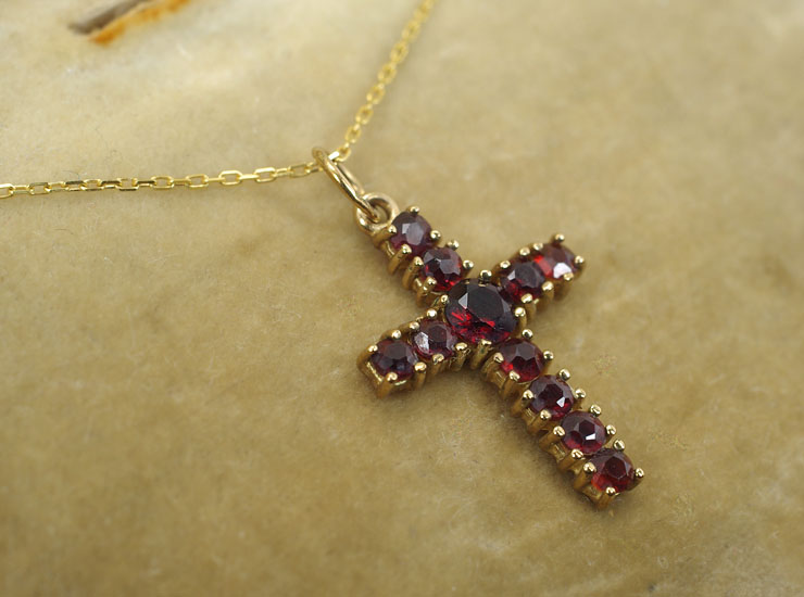 1969年のイギリス製ヴィンテージガーネット十字架ペンダントです。深い赤色のガーネットはしっとりとした光沢がありとても綺麗です。地金は9金イエローゴールド。着用時の全体の長さが23ミリと普段使いにぴったりです。お手持ちのチャームなどと重ねてお使いいただくこともできます。
