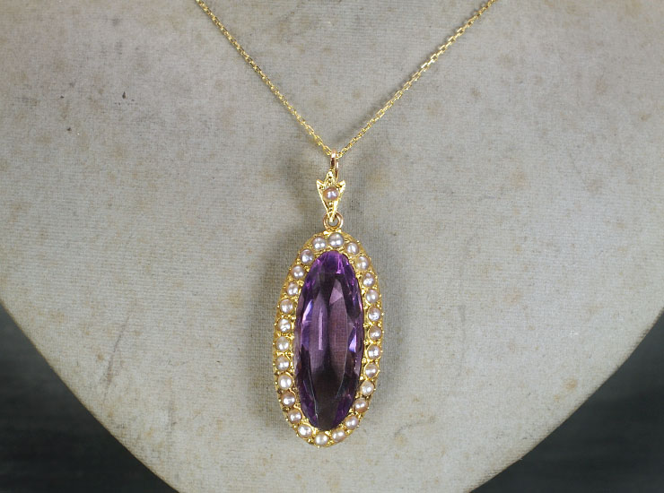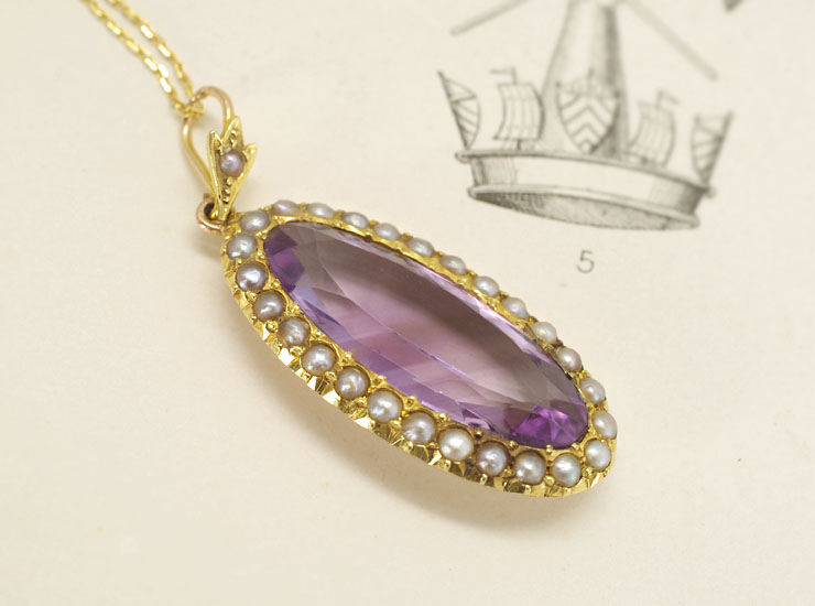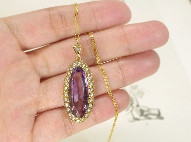 アンティーク15金ゴールド大粒アメジスト・シードパールペンダント