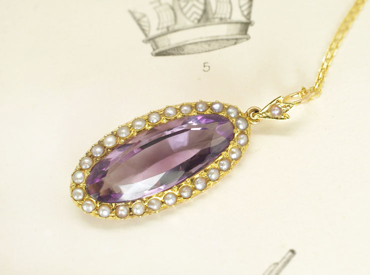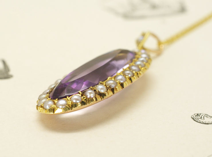 1900年頃のイギリス製アンティークペンダントです。鮮やかな紫色のアメジストは、潤いを含んだ光沢で光を受けるとピンクを帯びた輝きが底からふわっと湧いてきます。小さなシードパールがアメジストをぐるりと囲み、上品で華やか。シードパールは艶があり、ほんのりブルーグレーを帯びたもの、クリーム色を帯びたものと一粒一粒が違うのも天然らしく、画一的でない美しさがあります。