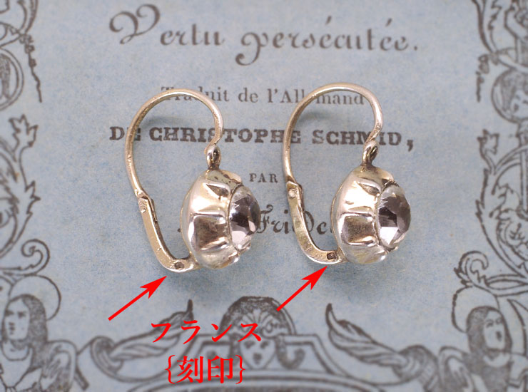 ペーストは、後ろが覆われたクローズドバックセッティングになっています。地金はシルバー(銀)。ピアスは、耳の後ろから通して前で留めるドルムーズと呼ばれるフランス製のピアスに見られるスタイルです。このタイプのピアスは、初めのうちは着けるのにコツがいり少々難しいのですが、慣れると通常のピアスと変わりなく簡単に着用できるようになります。