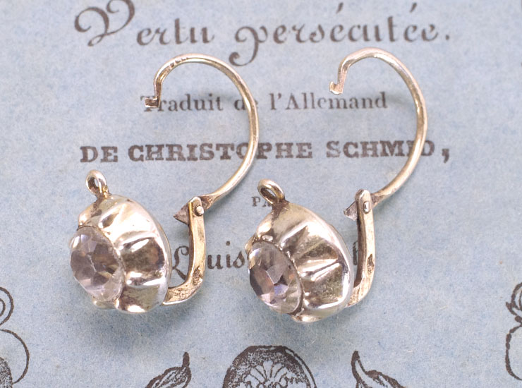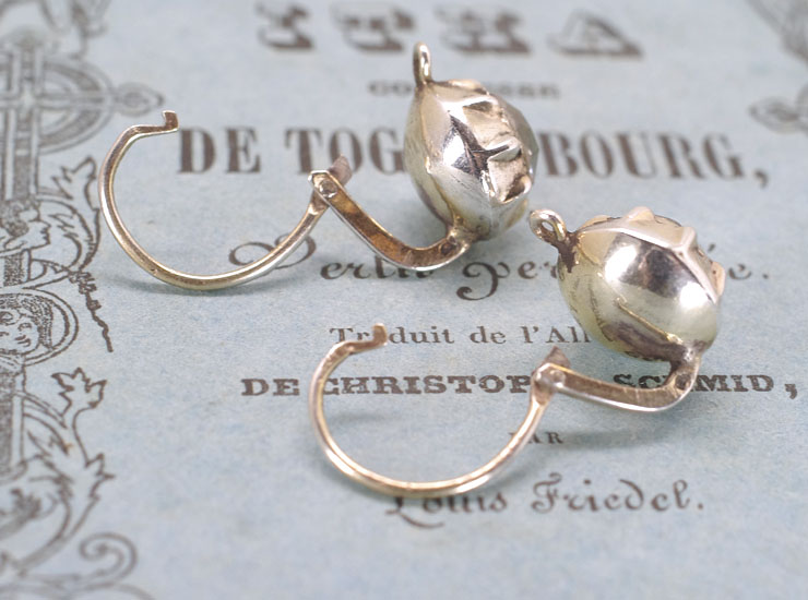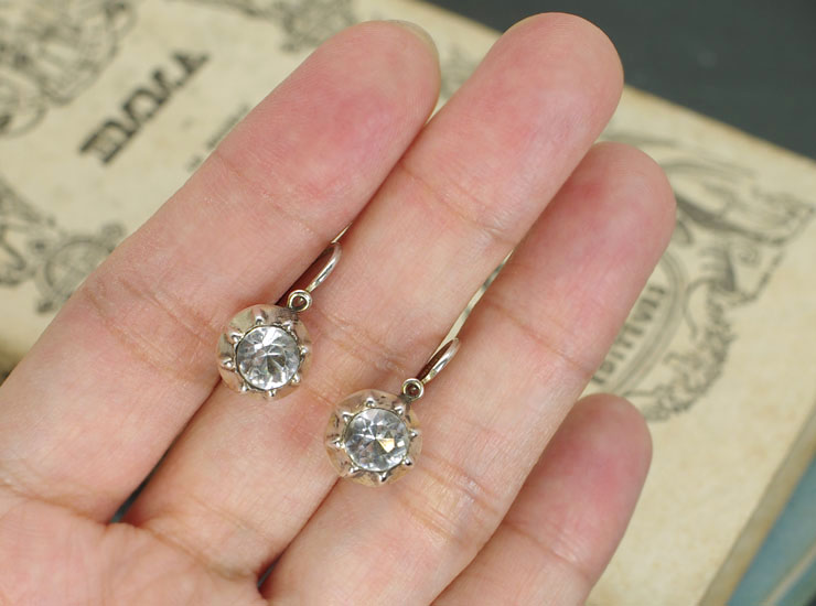 1800年代後期のフランス製アンティークピアスです。ダイヤモンドのように輝くこの大粒の石は、ペースト(ガラス)です。ガラスだから価値がないと思いがちですが、アンティークのペーストジュエリーは手の込んだ作りになっていて、高価格で取引されています。当店ではシルバーのジュエリーはほとんど仕入れないのですが、こちらは特別に心惹かれて入手いたしました。一見とてもシンプルですが、ぽってりと丸いセッティングに大粒のペーストの組み合わせが美しく独特の趣があります。