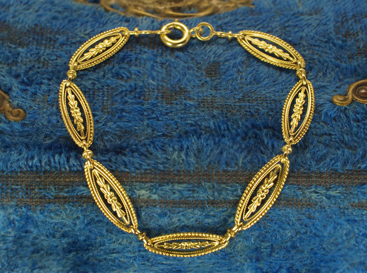 ブレスレットにフランスの18金のホールマーク(鷲の頭)入り。アンティーク18金フィリグリーブレスレットはよい状態です。