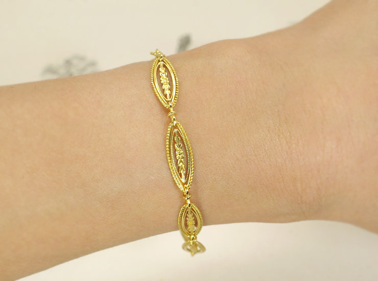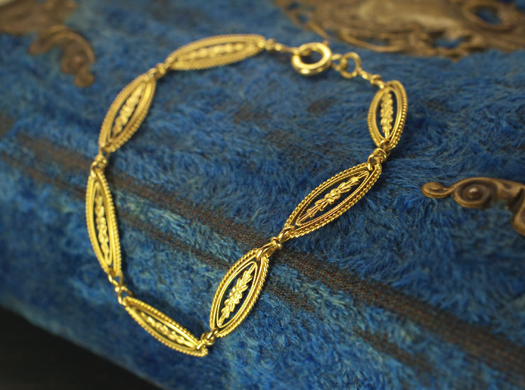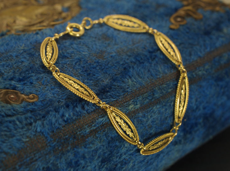 1900年頃のフランス製アンティークブレスレットです。一つ一つ細工が丁寧に施され、美しく仕上がっています。よく見るとお花の細工になっていてとてもチャーミング。それぞれの金細工モチーフがわずかに手首に沿って曲線になっていますので、自然に手首に沿います。モチーフは縦6.5ミリ×横18ミリ。地金は18金。長さは17.3センチと平均的な日本女性にぴったりなサイズ感です。(着用写真のモデル:手首周り14センチ)。18金ですので当然硬いのですが、透かしがレースのように繊細で、手を動かすたびに肌の上をさらさらと流れ優雅です。大人の女性にもご満足いただけるチャーミングなアンティークフィリグリーブレスレットです。