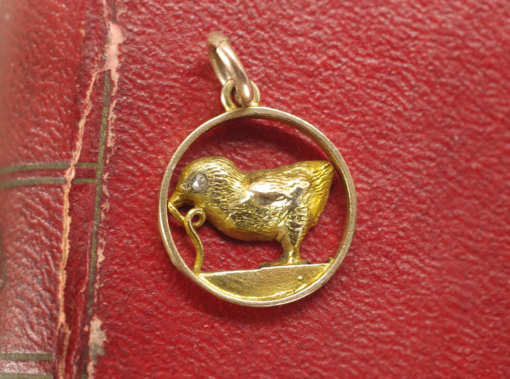 ヴィクトリアン後期1890年頃のイギリス製アンティークチャーム・ペンダントです。ひよこの柔らかな毛並みやふっくらとした体まで表現された丁寧で細やかな作り。口ばしにはくるりと巻いたミミズを銜えています。目にはローズカットのとても小さなダイヤが埋め込まれ、これほど凝った作りはさすがアンティークです。アンティークのチャームはめったに見つからず、さらにこれほど細やかな作りのものは非常に希少です。写真では良さが伝わりづらいのですが、実際に手に取ると、ひよこの温もりが感じられ、ずっと眺めていたくなる趣のあるチャームです。地金は9金。