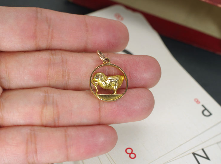 刻印はありませんが、ゴールドテスターにて9金と確認済み。アンティーク9金ミミズを食べるひよこチャーム・ペンダントは良い状態です。
