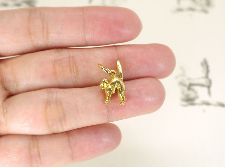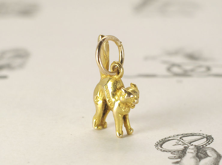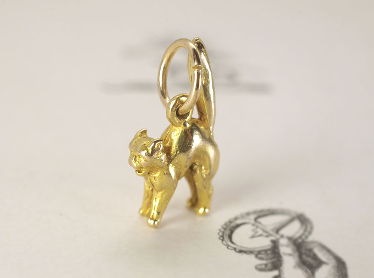 1958年のイギリス製ヴィンテージチャームです。背中を丸め尻尾をピンと伸ばした、びっくりした様子の猫が表現された小さなチャームです。本物をミニチュアにしたような立体的な作りで、置いてみるとちゃんと立ちます。とても可愛らしいチャームです。地金は9金。