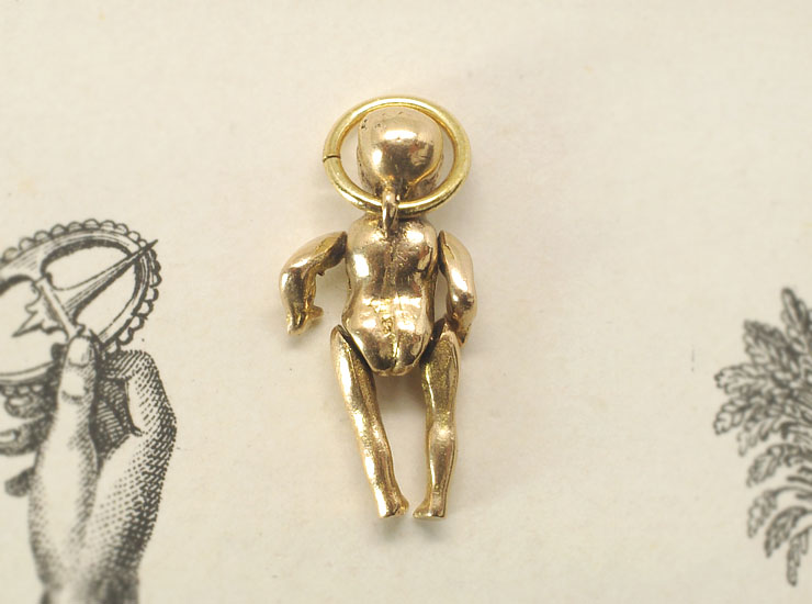 チャーム(ドール右足部分)に9金、1963年を示すイギリスのホールマーク(刻印)入り。ヴィンテージ9金ドールチャームは良い状態です。