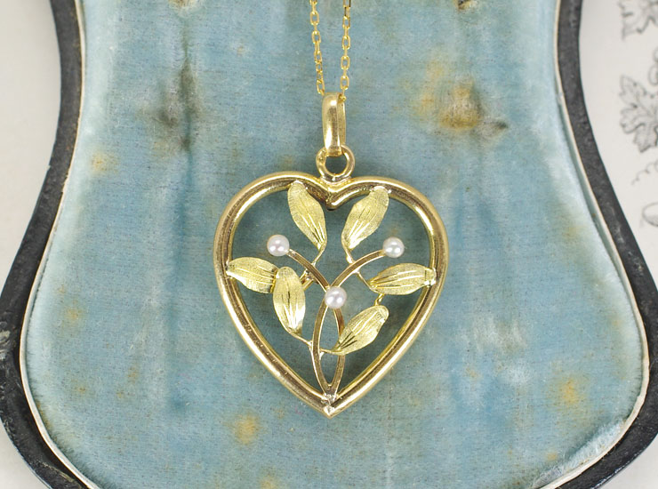 1900年頃のフランス製アンティークペンダントです。フランスのジュエリーに古くから用いられてきた宿り木がモチーフのペンダントです。うねった葉やぷっくりとしたシードパールが、ハートから立体的に浮き出たデザイン。葉には緑がかったゴールドが使用され、宿り木の生き生きとした枝ぶりが繊細に表現されています。