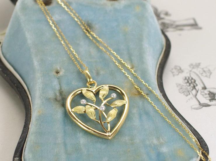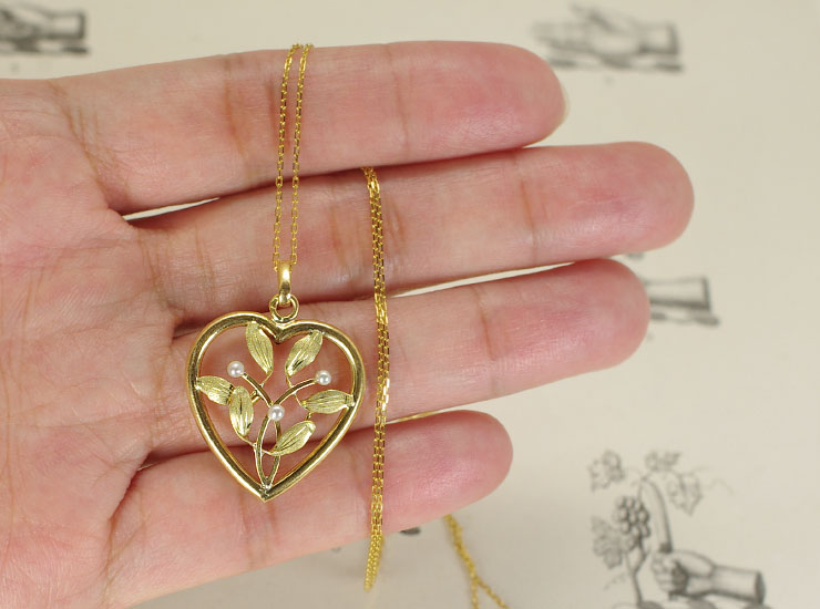 地金は18金。シードパールは1.8ミリ〜2ミリ。着用時の全体の長さは27ミリ。1.7グラムと軽量ですので細いチェーンにも合わせていただけます。ハートと宿り木のロマンティックなアンティークペンダントです。