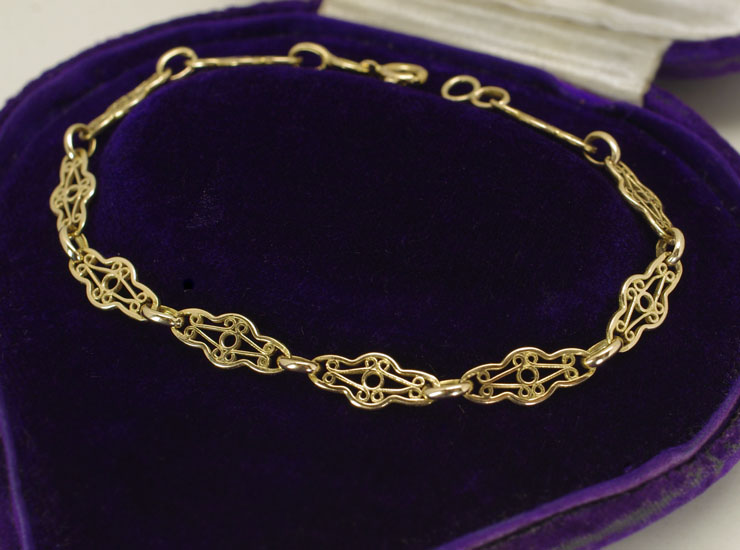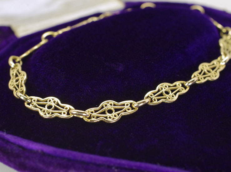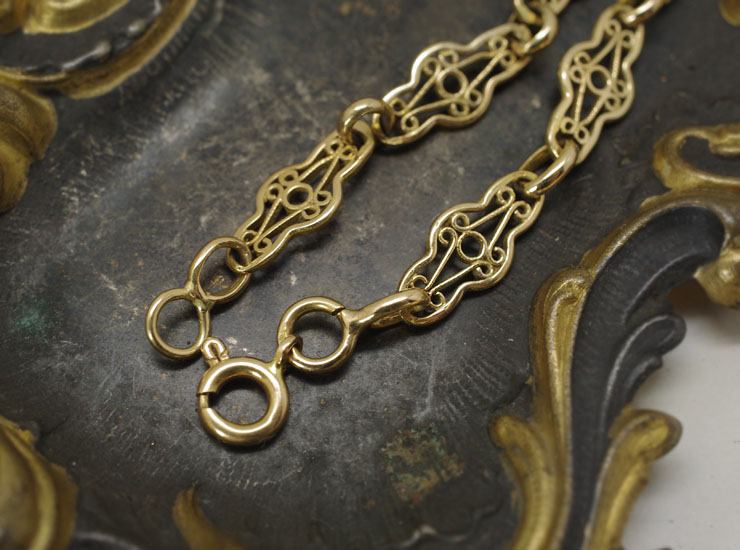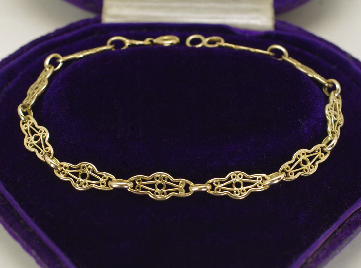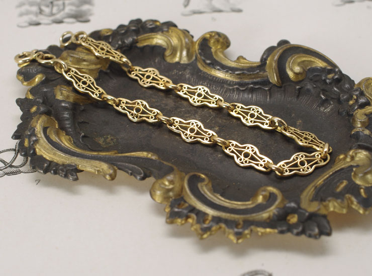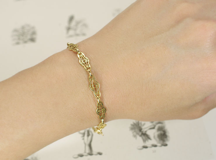1900年頃のフランス製アンティークブレスレットです。地金は18金で、透かし金細工が10個繋げられた美しいブレスレット。金細工パーツのサイズは縦6ミリ×横15ミリ。くっきりとした曲線を描いた模様に光が反射し、手首を動かすたびに陰影が浮かび上がりとても綺麗です。日常的にご使用になりやすいサイズとデザインですので、お手持ちのジュエリーや腕時計に合わせたり、他のブレスレットと重ねたりと毎日活躍します。長さは18センチで、平均的な日本女性にぴったりの長さです。(着用写真のモデル:手首周り14センチ)。