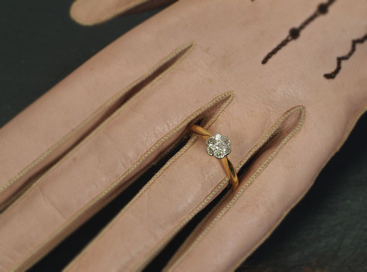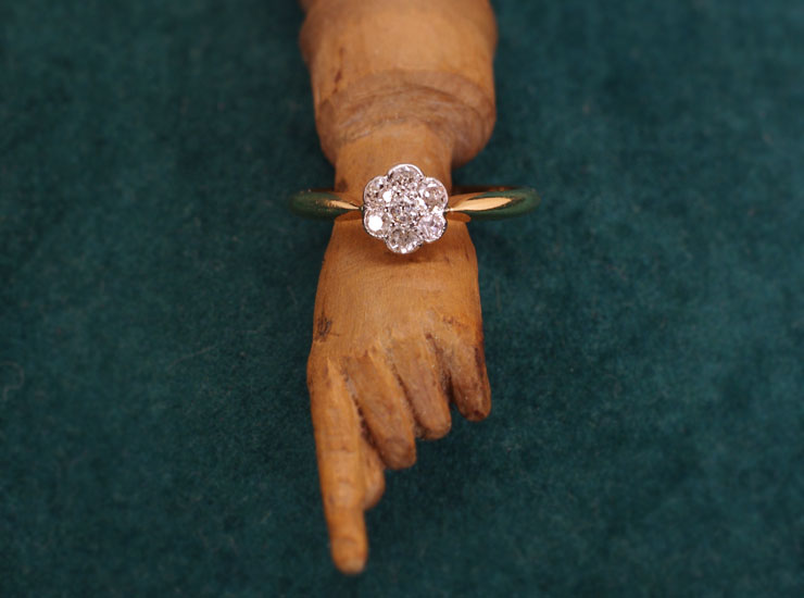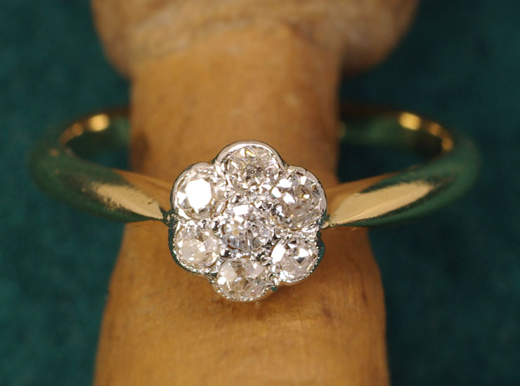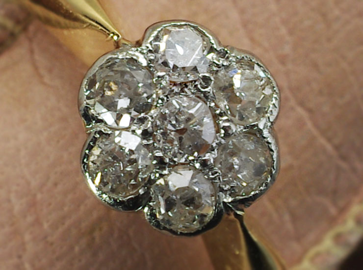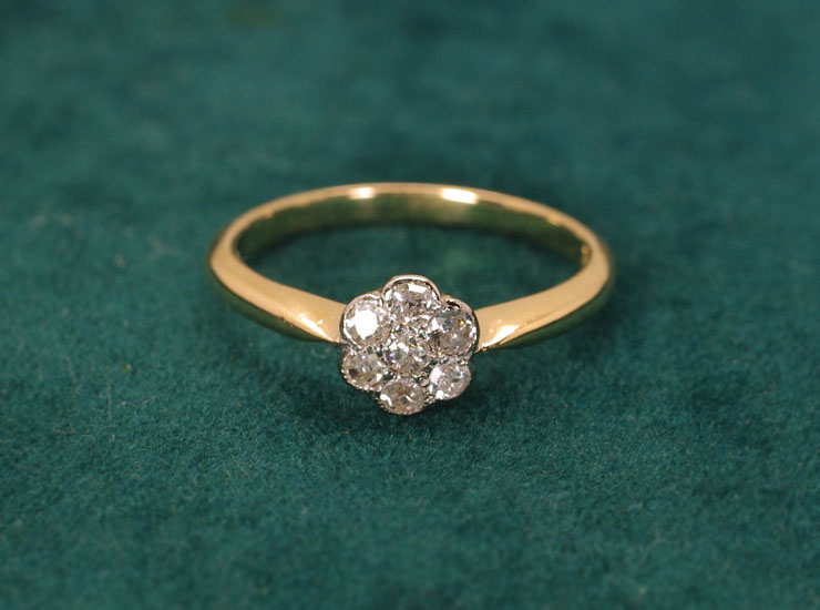 1920年頃のイギリス製アンティークリングです。ダイヤのお花が指先で眩いばかりに輝きます。デイジーリングと呼ばれる当時人気のあったお花のデザインのリングです。ダイヤは合計7石で大きさは1.5ミリ〜1.7ミリ。今回こちらのリングは半額の特別価格でご紹介しております。その理由ですが、ルーペで確認すると、わずかにカットが不揃いであったり、表面に非常に小さな傷があるダイヤが含まれています。肉眼ではまったく確認できない程度で、全体的に良いコンディションですので、大変お買い得になっています。