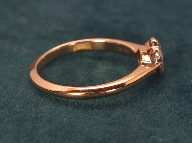 リング内側に「18CT」と18金を示す刻印入り。ダイヤに肉眼ではまったく確認できない程度のカットの不揃い、僅かな傷があります。リング全体は良い状態です。
