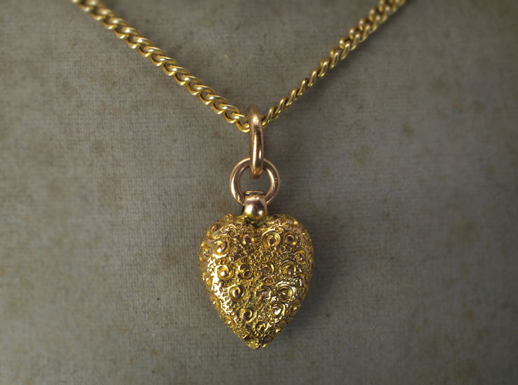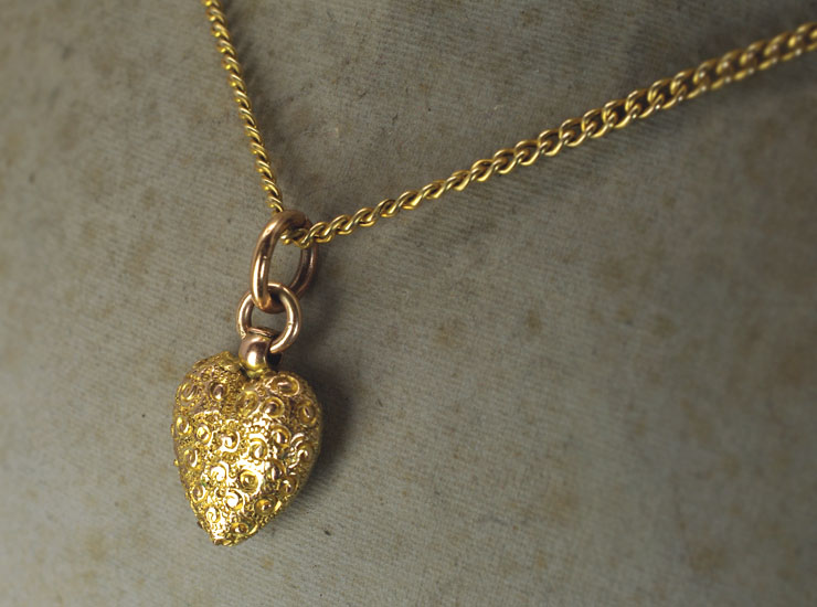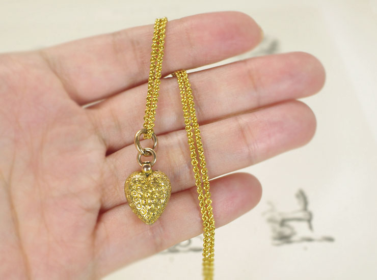 1890年頃のイギリス製アンティークペンダントです。一つ一つの模様が手彫りされた手の込んだ作りです。ルーペで見ると、とても小さな渦巻きと間には肉眼では見えない程の細かな粒の細工が施されています。全て手作業で作られていますので、実際に身に着けるとその細工の美しさから一目で上質のものと分かります。大人の女性にふさわしいハートジュエリーです。