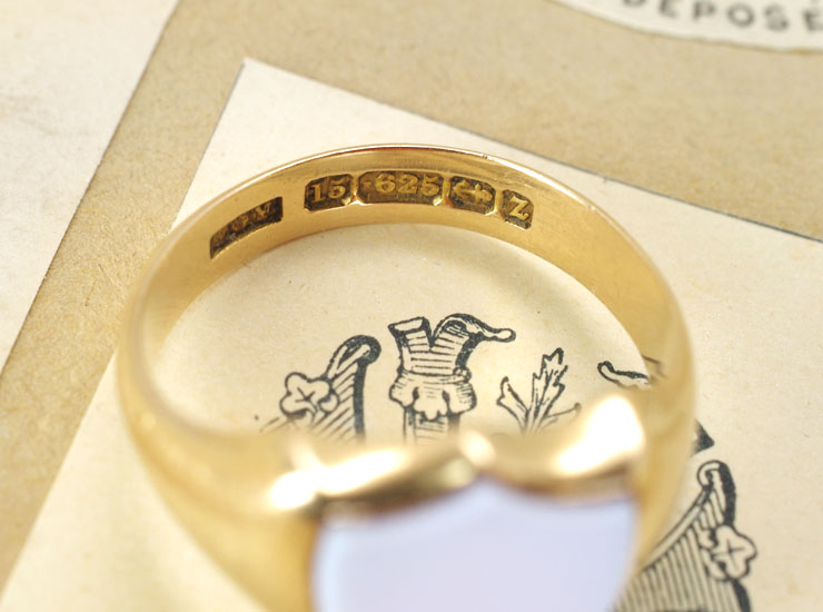 リング内側に1899年、15金を示すイギリスのホールマーク(刻印)入り。アンティーク15金シールドリングは良い状態です。