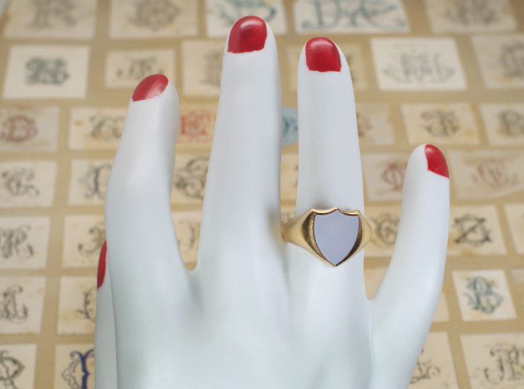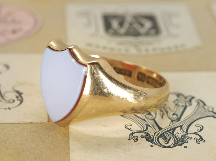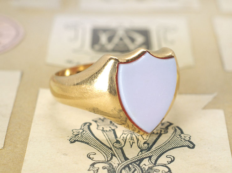 1899年のイギリス製アンティークリングです。シールド(盾)型に象られたサードオニキスが美しい男性用リングです。通常石の表面に モノグラムなどが彫られていることが多いのですが、こちらのリングは何も彫られておらず、使用感も比較的少なく良い状態です。