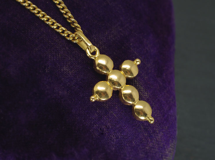 十字架のサイズは縦22ミリ×横19ミリ。ガーネットのサイズは4ミリ。着用時の全体の長さは31ミリ。このタイプのアンティーククロスペンダントでは比較的小ぶりなサイズですので、普段のファッションにもコーディネートしやすいと思います。