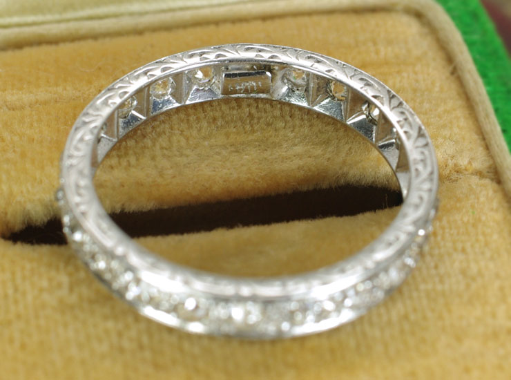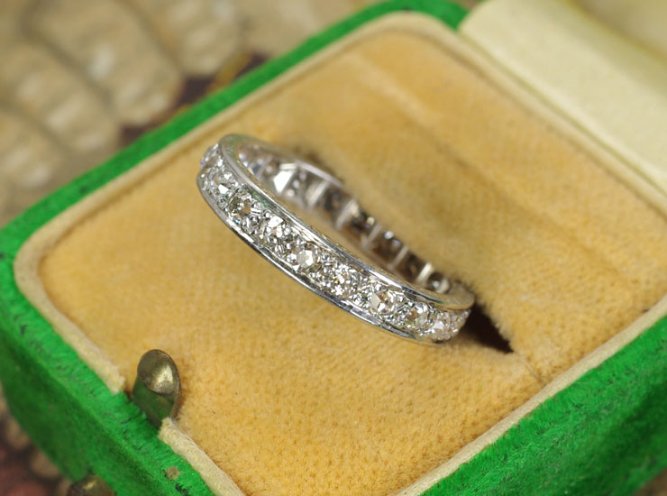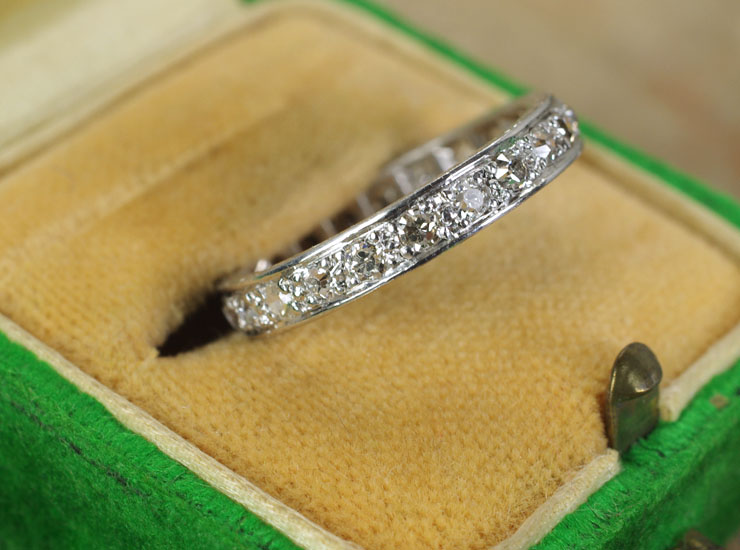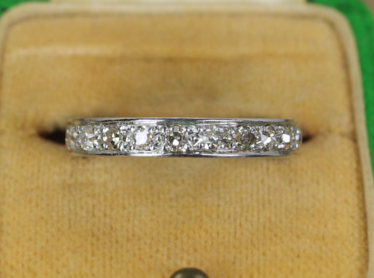 アンティークジュエリーでは珍しく地金はすべてプラチナ。リング幅は3ミリ。リング側面は1.4ミリ。ダイヤがぐるりと一周入っていますので、サイズ直しはできません。厚みのあるしっかりとした作りですので、日常的にご使用いただけます。婚約指輪や大切な記念日のリングとしてもお勧めのハイクォリティのアンティークダイヤエタニティリングです。
