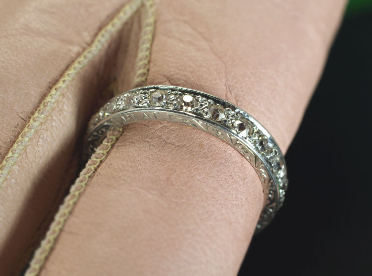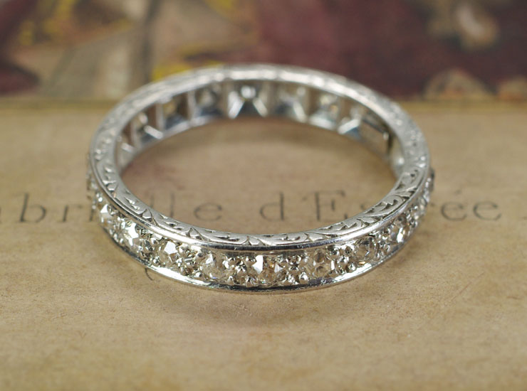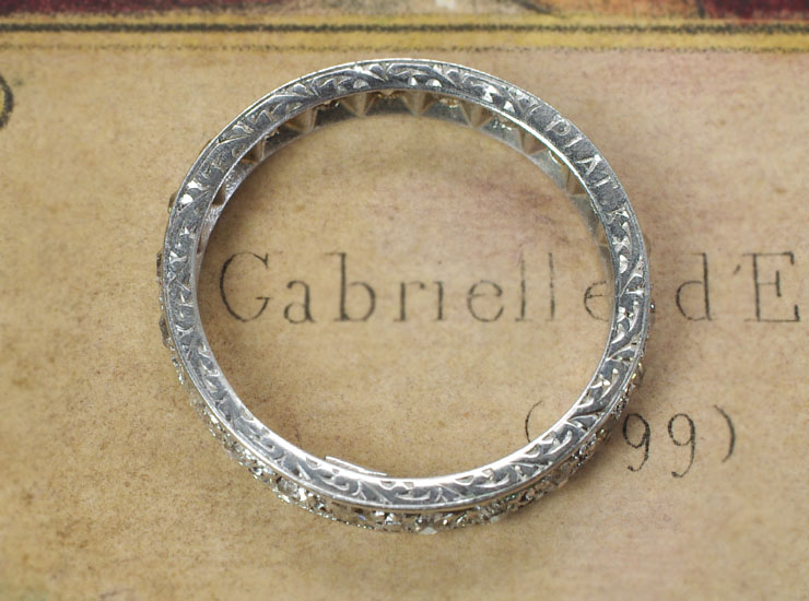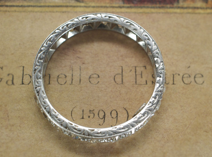 1930年頃のイギリス製アンティークリングです。透明感のある煌びやかな輝きのオールドカットのダイヤのエタニティリング。ダイヤの大きさは1.8ミリ〜2ミリで、指を動かすと一斉に光を放つ様子から目が離せません。両側面には伝統的な唐草模様が手彫りされ、立体感のある陰影がダイヤをより美しく見せてくれます。