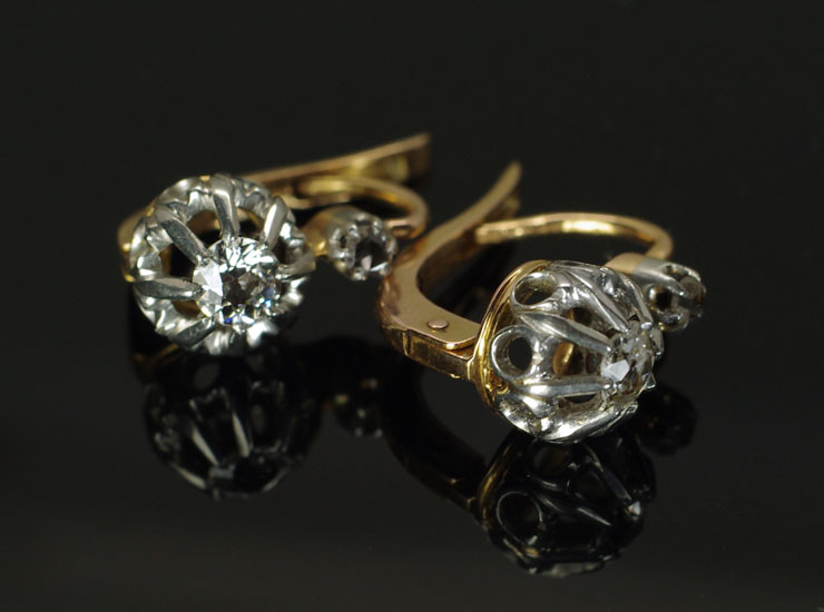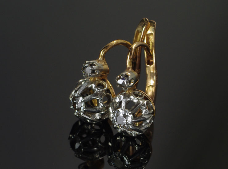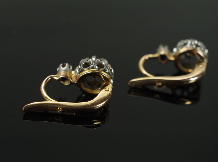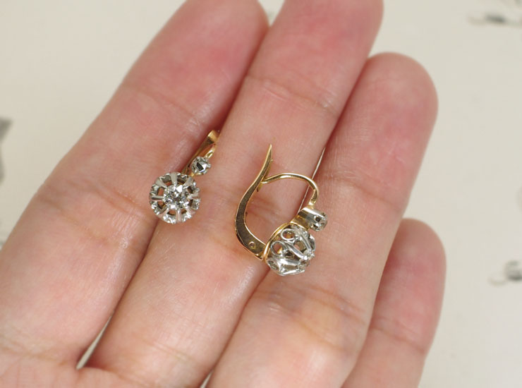 1910年頃のフランス製アンティークピアスです。輝きの強いオールドカットのダイヤが主役のアンティークピアス。その煌びやかな光を写真では捉えきれなかったのですが、本当に美しい輝きです。明るい屋外ではもちろんですが、オールドカットのダイヤは室内の暗めの照明でより美しく輝くように思えます。メインのダイヤは直径3ミリ。素晴らしい輝きは実際のサイズ以上に存在感を放っています。上のローズカットの小さなダイヤは1.5ミリ。メインのダイヤとは異なったカットで、上下のダイヤが時間差で光を反射する様子はアンティークらしい趣で面白いです。地金は18金ホワイトゴールドとややピンクがかった18金ゴールドの2色が使われています。ピアスは後ろの留め具が上下に開閉するタイプで、見た目も美しく着用しやすいためとても人気があります。