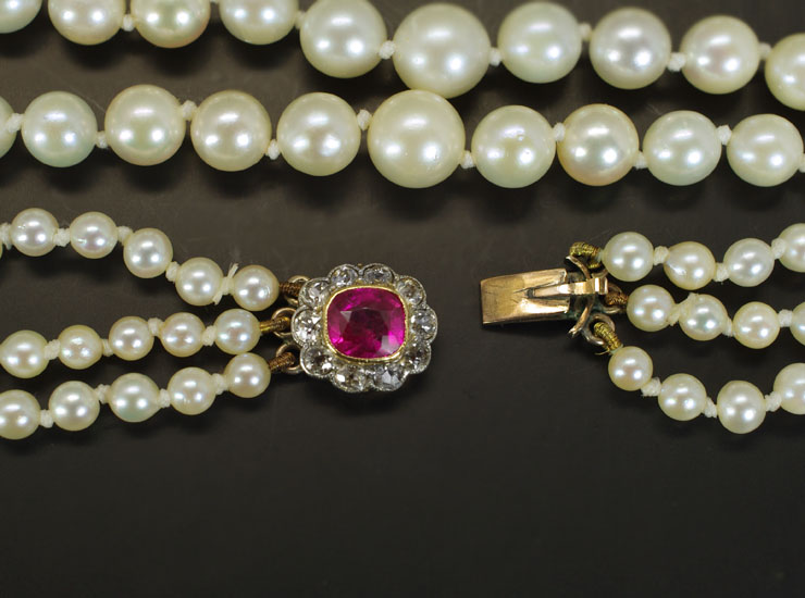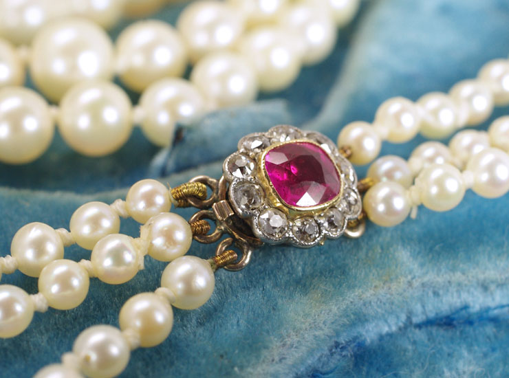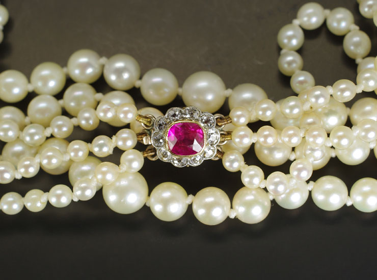 クラスプの地金は9金(刻印なし、テスト済)。合成ルビーは縦5ミリ×横6ミリ、10石の小さなダイヤがルビーをぐるりと囲んでいます。ダイヤは1.5ミリ〜1.8ミリと小さいですが、美しい輝きを放ちます。クラスプ全体のサイズは縦9ミリ×横11ミリ。状態の良い美しいパールネックレスです。