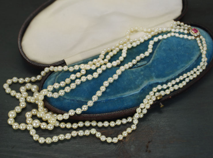 1930年頃のイギリス製アンティークネックレスです。ネックレスは三連になっていて、長さも真珠の大きさもグラデーションになっています。長さは一番内側にくる内径45センチ、中央49センチ、外側53センチ。真珠は3ミリ〜7ミリで、クラスプ近くの真珠は3ミリ程で、中央になるにつれ、だんだんと大きくなるように配置されています。真珠は肌色を綺麗に見せてくれる明るいクリーム色でしっとりとした艶も綺麗です。ネックレスは糸替えをされています。真珠と真珠の間に結び目を入れるオールノットで留められています。