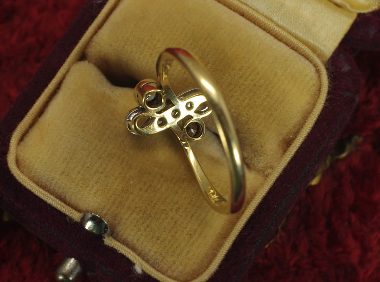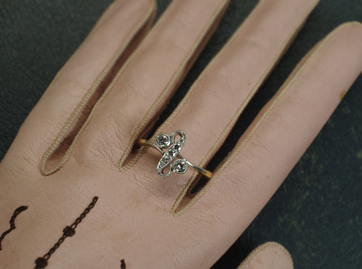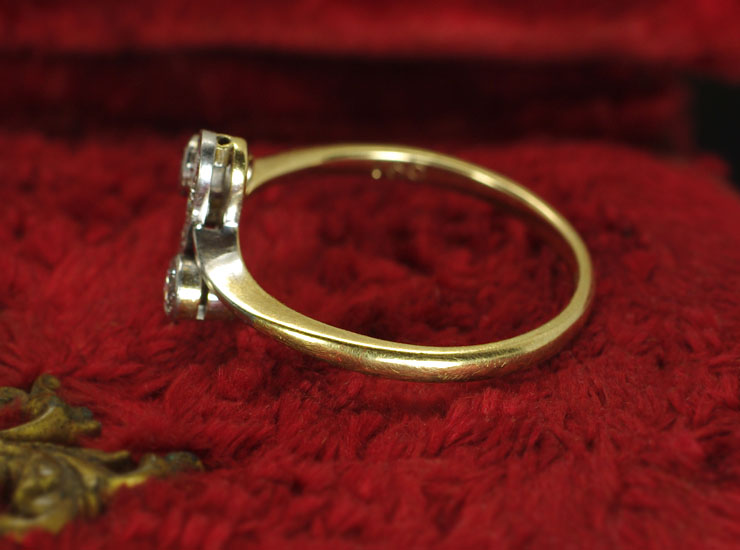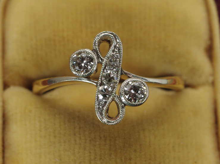 1910年頃のイギリス製アンティークリングです。アールヌーボーの優雅な曲線に眩いばかりに輝くダイヤ。メインの2石のダイヤは3.1ミリ。縦の曲線ラインに配置された3石のダイヤは2ミリ。無数の光がダイヤの底から湧き上がり、さらに光を受けると強い輝きがほとばしります。その力強い輝きは、遠くから見ても抜群の存在感があります。